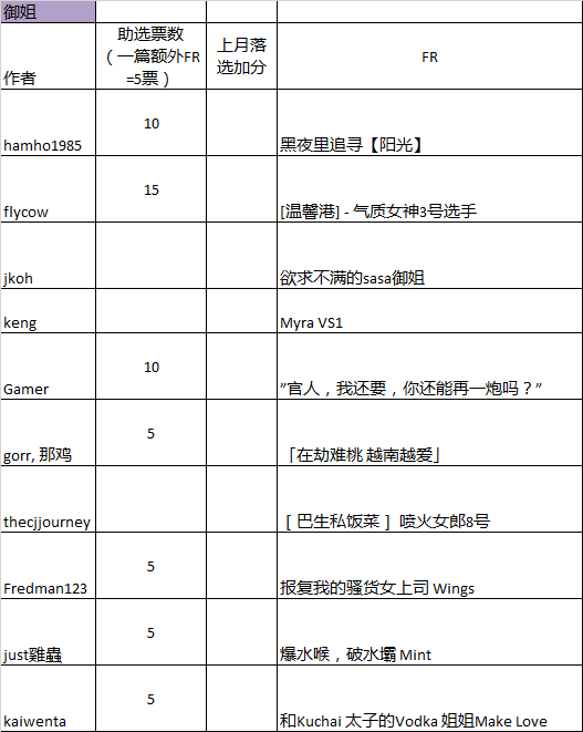 经过雄猫网内部几日的筛选,评选环节:8月雄猫网主题FR活动——【萌】与【御】的各10篇FR已被选出,请各网友们参考以下FR来投选出优胜FR。