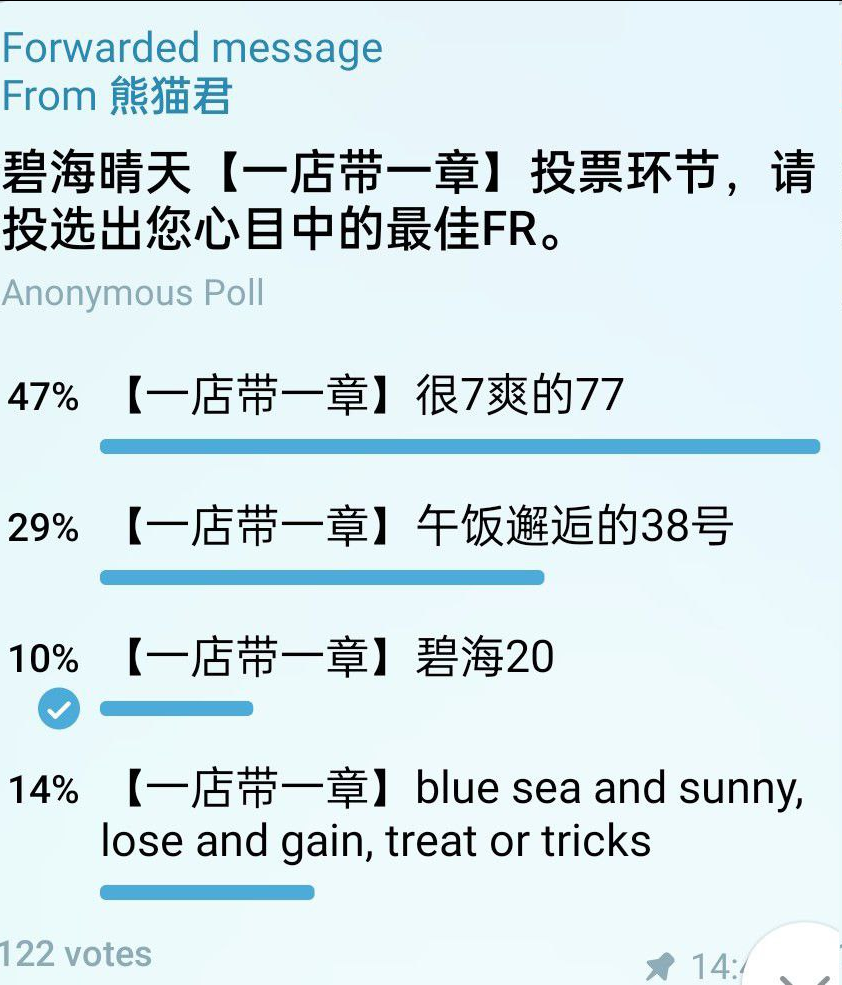 投票结束!碧海晴天 【一店带一章】的最佳FR是: