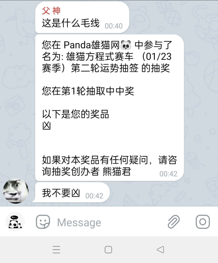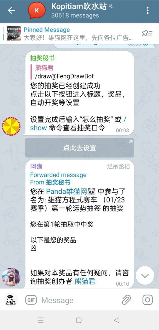 熊猫君所使用的的抽签方式为telegram的一个小程序应用——抽奖秘书,并提前找来了两位网友帮忙进行抽签,他们是雄猫网交流群的“阿瞒”&“阿灿”。