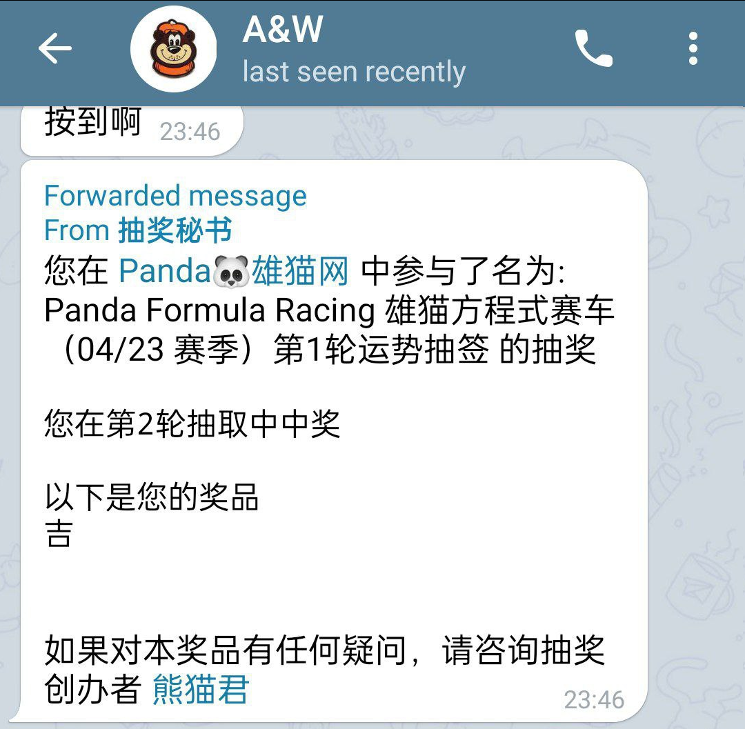 熊猫君所使用的的抽签方式为telegram的一个小程序应用——抽奖秘书,虽然这次也是提前找来了网友帮忙进行抽签,但运势签却被别的网友乱入抽掉了,抽了签的网友是雄猫网交流群的“A&W”。