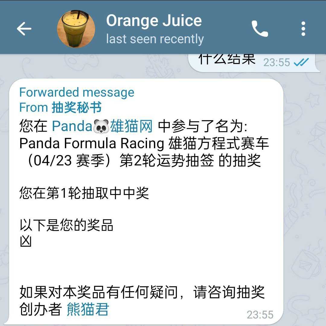 熊猫君所使用的的抽签方式为telegram的一个小程序应用——抽奖秘书,并提前找来了网友帮忙进行抽签,他是雄猫网交流群的“Orange Juice”。