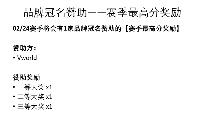 02/24赛季将有1家品牌冠名赞助的【赛季最高分奖励】。