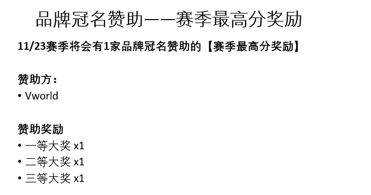 11/23赛季将有1家品牌冠名赞助的【赛季最高分奖励】。