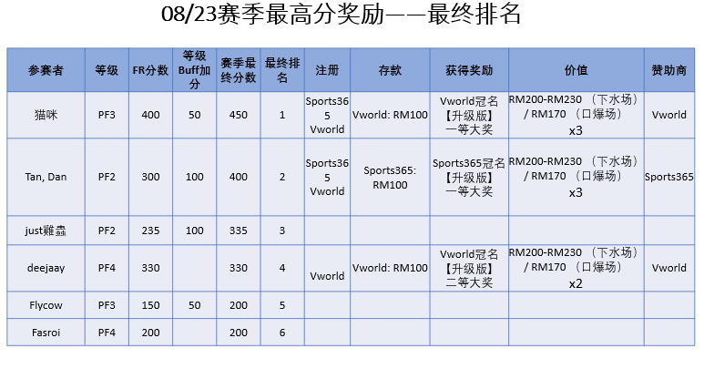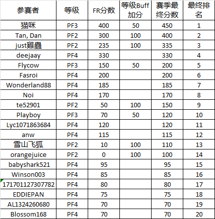 由于熊猫君生病多时,导致上赛季的最终排名延后至此,万分抱歉。