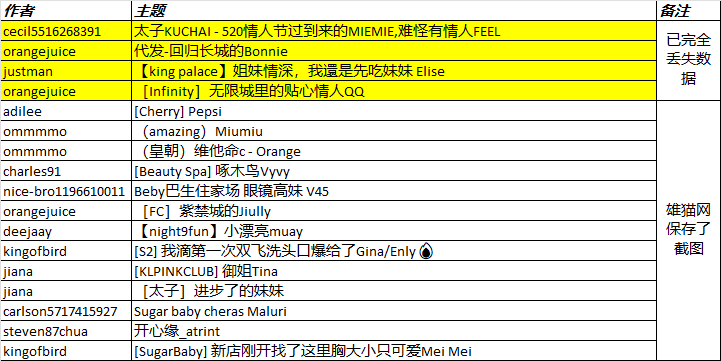 至于黄色Highlight的4个主题帖子,则数据已经完全丢失,需要网友重新写过帖子,非常不好意思。