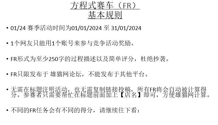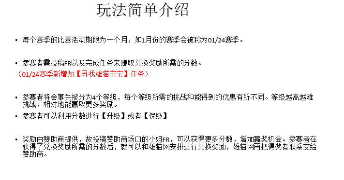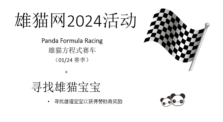 大家好!雄猫网在新的一年的1月份将会继续举办Panda Formula Racing 雄猫方程式赛车,本月将是01/24赛季,这次会新增加新的任务——寻找雄猫宝宝任务!