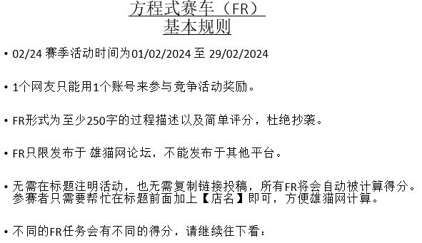 大家好!雄猫网祝大家新年快乐!在2月份将会继续举办Panda Formula Racing 雄猫方程式赛车,本月将是02/24赛季。