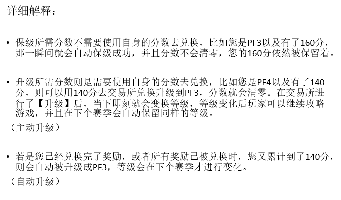 或者是这个情况,目前我Pf3,这赛季攒够160分就将会被记录然后在下一个赛季自动保级在Pf3,然后我的160分将不会被扣除,可以自由使用,并且用了分数之后不会影响下个赛季掉级?