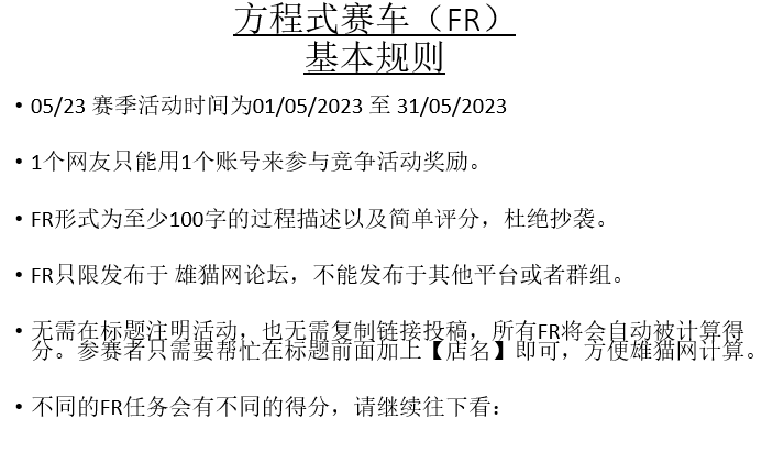 大家好!雄猫网在5月份将会继续举办Panda Formula Racing 雄猫方程式赛车,本月将是05/23赛季。