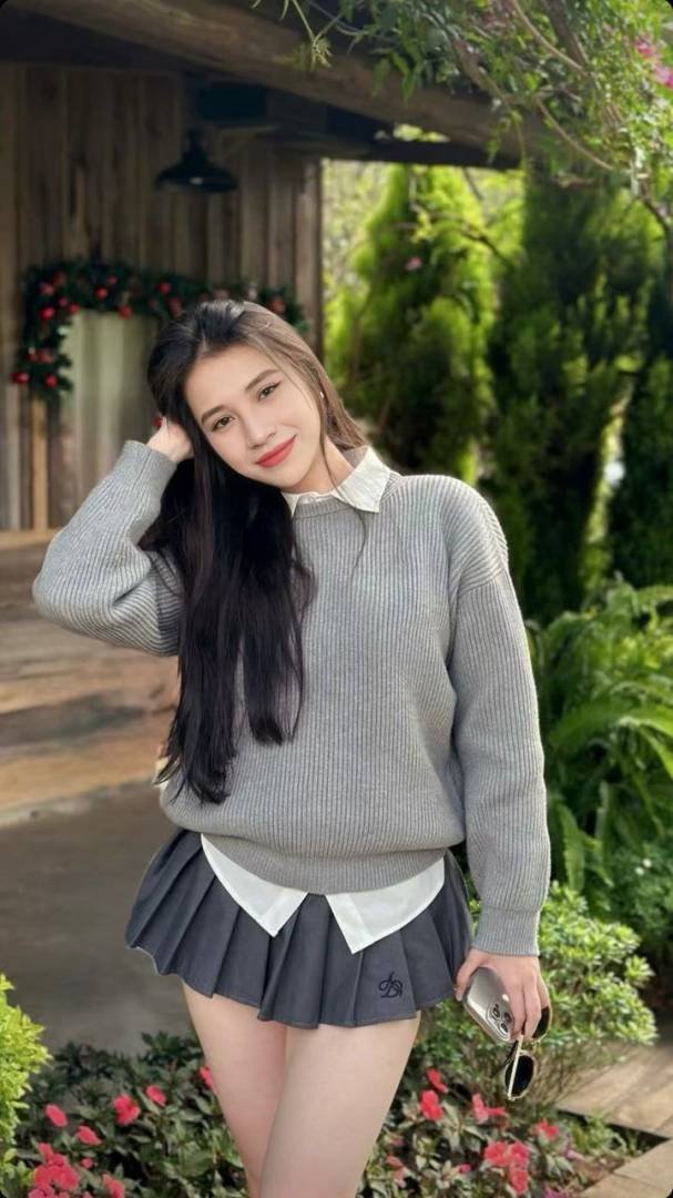 她刚好也穿着学生妹的短裙,留着一头波浪形〰️的头发,带点古铜色的皮肤。虽然和照片有点出入,不过反而有点欧美女郎的feel~ 像极了校园时期的女神🤤