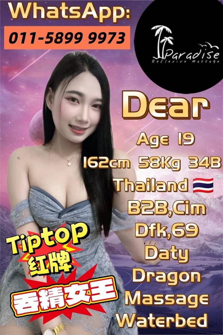 Dear有一双明亮的大眼睛特别勾魂,高鼻梁,嘴唇微微上翘,看起来有点混血的感觉,但整体比照片还要动人。身材也很不错,皮肤滑嫩,胸部不算大,但难得是泰国妹还保留真奶,脂肪主要堆在下半身,所以胸虽小,臀部却很大很翘。整体来说,她绝对是这区数一数二的美女,很多人说找小姐要看眼缘,Dear就是最好的例子,她一出现,客人就直接选她了,难怪几乎没机会在照镜时选她。