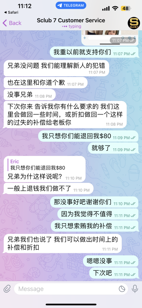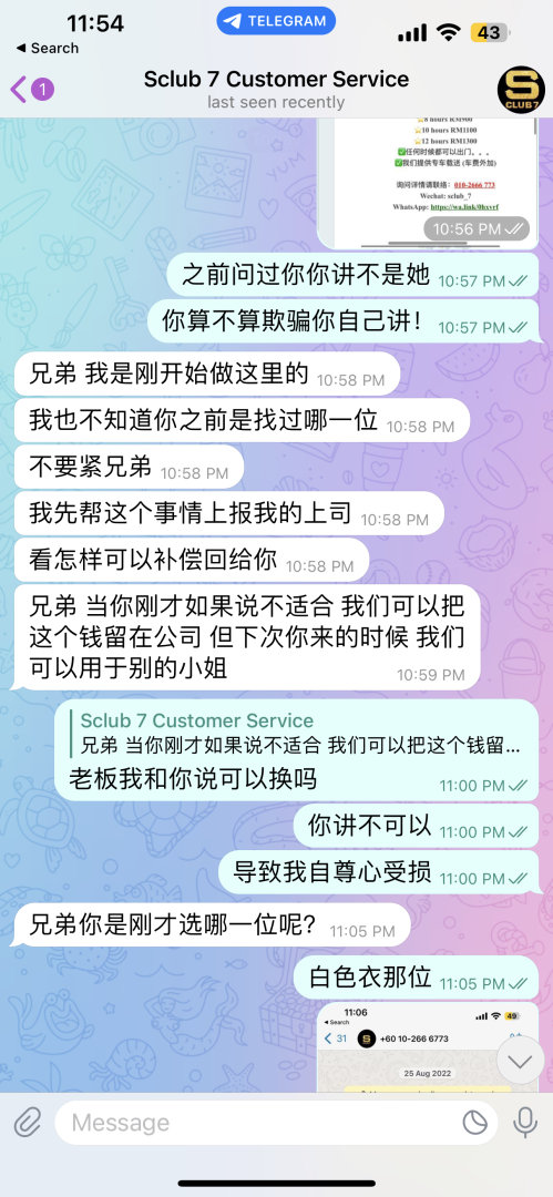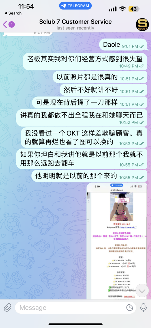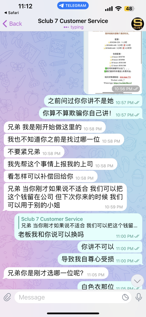 一时心急被我多年来支持的okt 骗了真的很失望。我联络okt 问他这本地妹新来的对吗,然后Sclub 7 管理员和我说对新来的重来没来过,我一进门okt和我收钱不给看小姐只讲收钱先然后才可以进我一时大意被他骗了然后进去而且那女的胖的和恐龙没分别,okt 讲微胖和不错的我才选进了我出来我问他可以换吗或者cancel 他讲不可以然后我就进去和妹子冲了凉然后坐着聊天而已根本没兴趣上恐龙。sclub7 telegram 管理员和我说没来过我问小姐上次看过你,你在这多久了她说几个月了呢,我要求okt退我$80可是他们不愿意不买单。这样的okt 真的烂