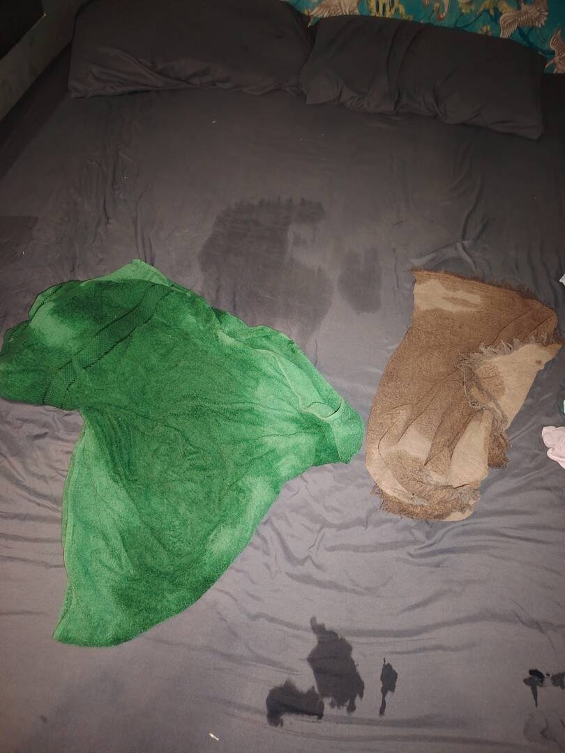 我最后以传教式猛干美眉,感觉来了就一边舌吻一边猛插,直到子子孙孙爆出来。爆发后,Mint直接拿掉套,直接帮我Hum7, Hum到升上天。看到两件毛巾跟床都湿透了,就拍个照留恋。