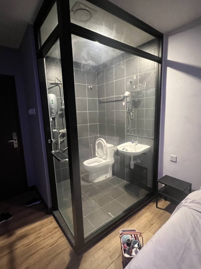Fitri用洗澡球把我身体前前后后洗干净,我也时不时出手hamsap一下,反而给她打屁股说nakal betul🤣 洗完澡躺着床上,看着Fitri洗澡 (透明洗澡间的好处)😍