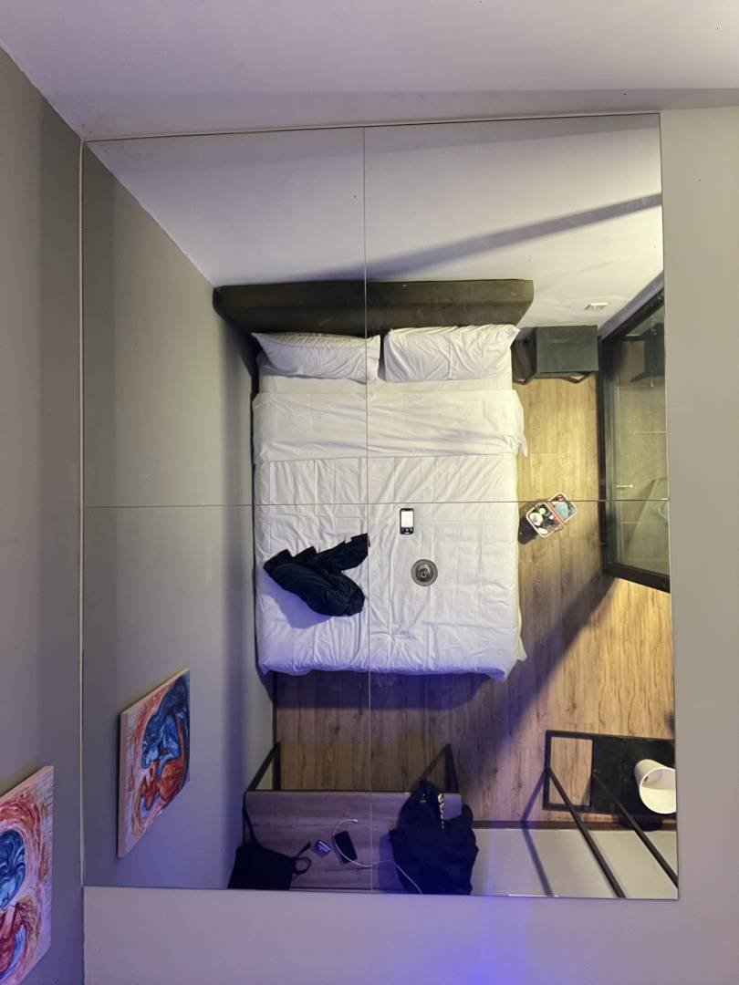 看了看房间,有透明的洗澡间 + 有镜子的天花板,应该会有不错的视觉效果。