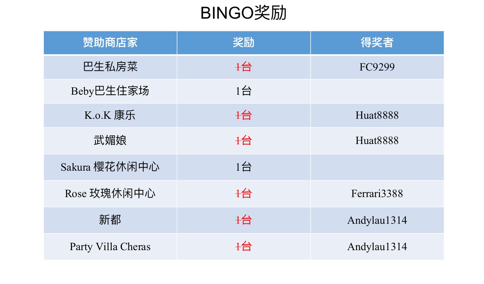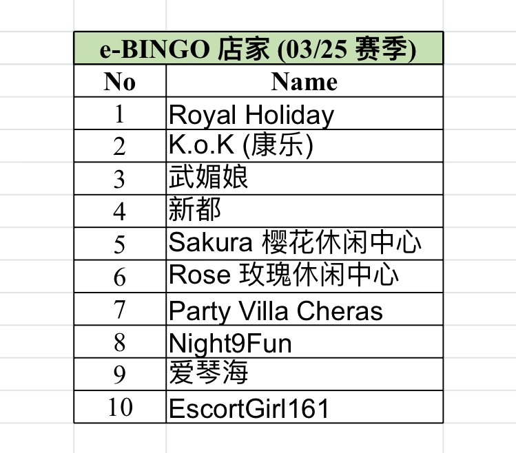 你手上有的是 Bingo 1 - Party Villa Cheras, Bingo 2 - 乐天堂,Bingo 2 - W Channel, e-BINGO.