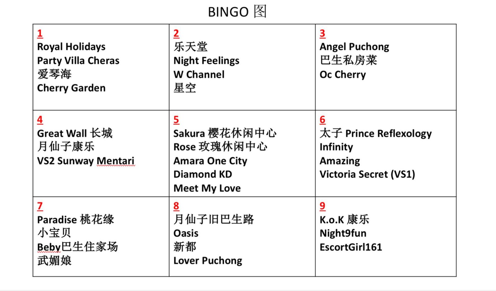 Bingo 1 (Party Villa Cheras) + Bingo 4 (Great Wall 长城) + Bingo 7 (Mix Bingo)