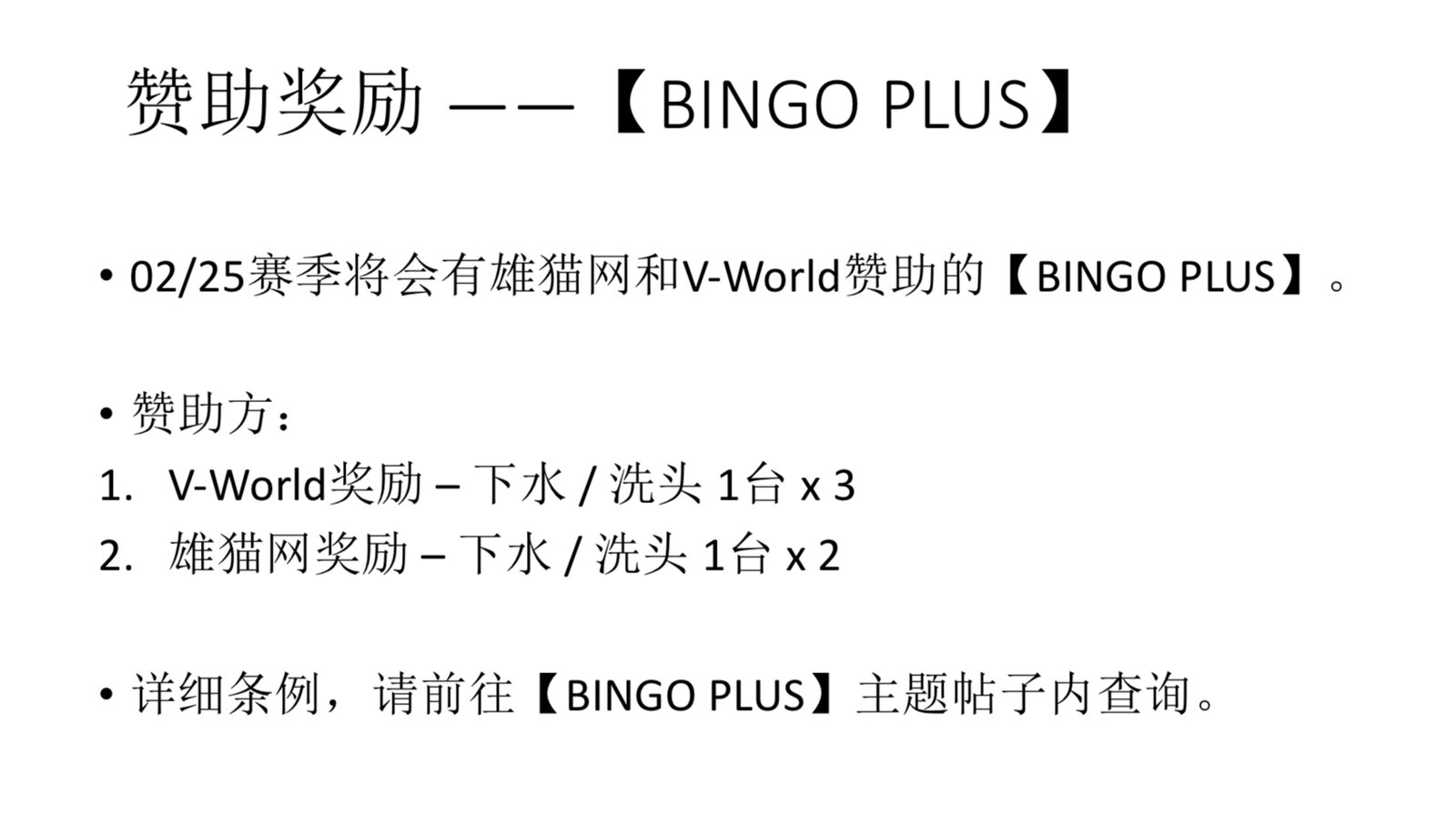 02/25 赛季将由雄猫网和V-World所赞助的【BINGO PLUS】。