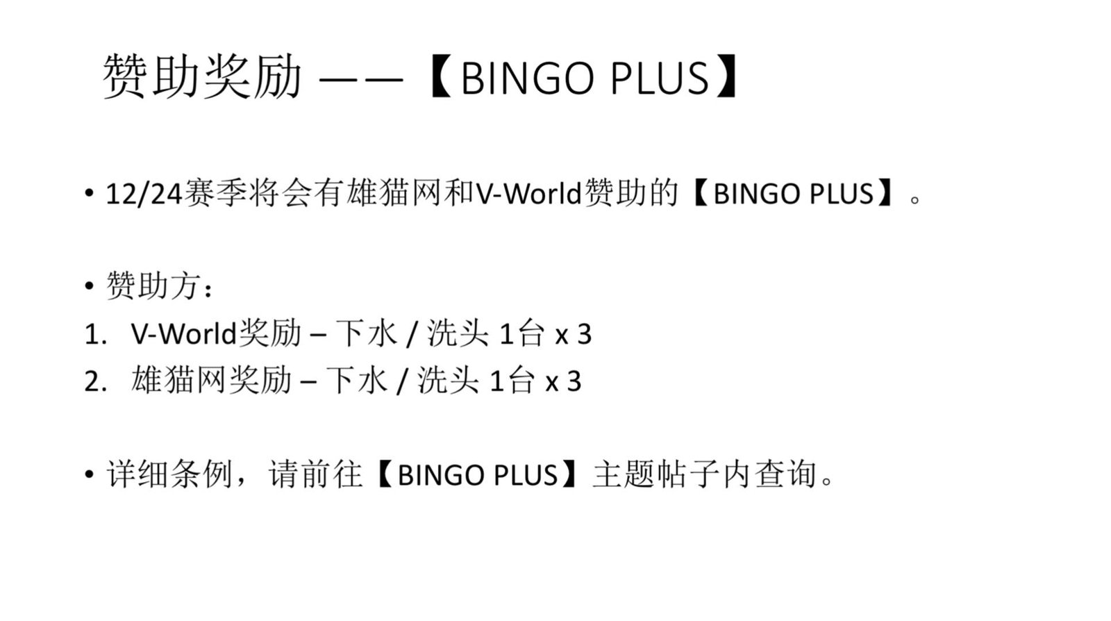 12/24赛季将由雄猫网和V-World所赞助的【BINGO PLUS】。