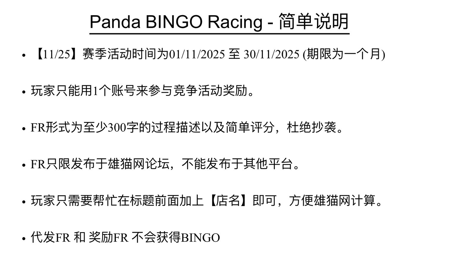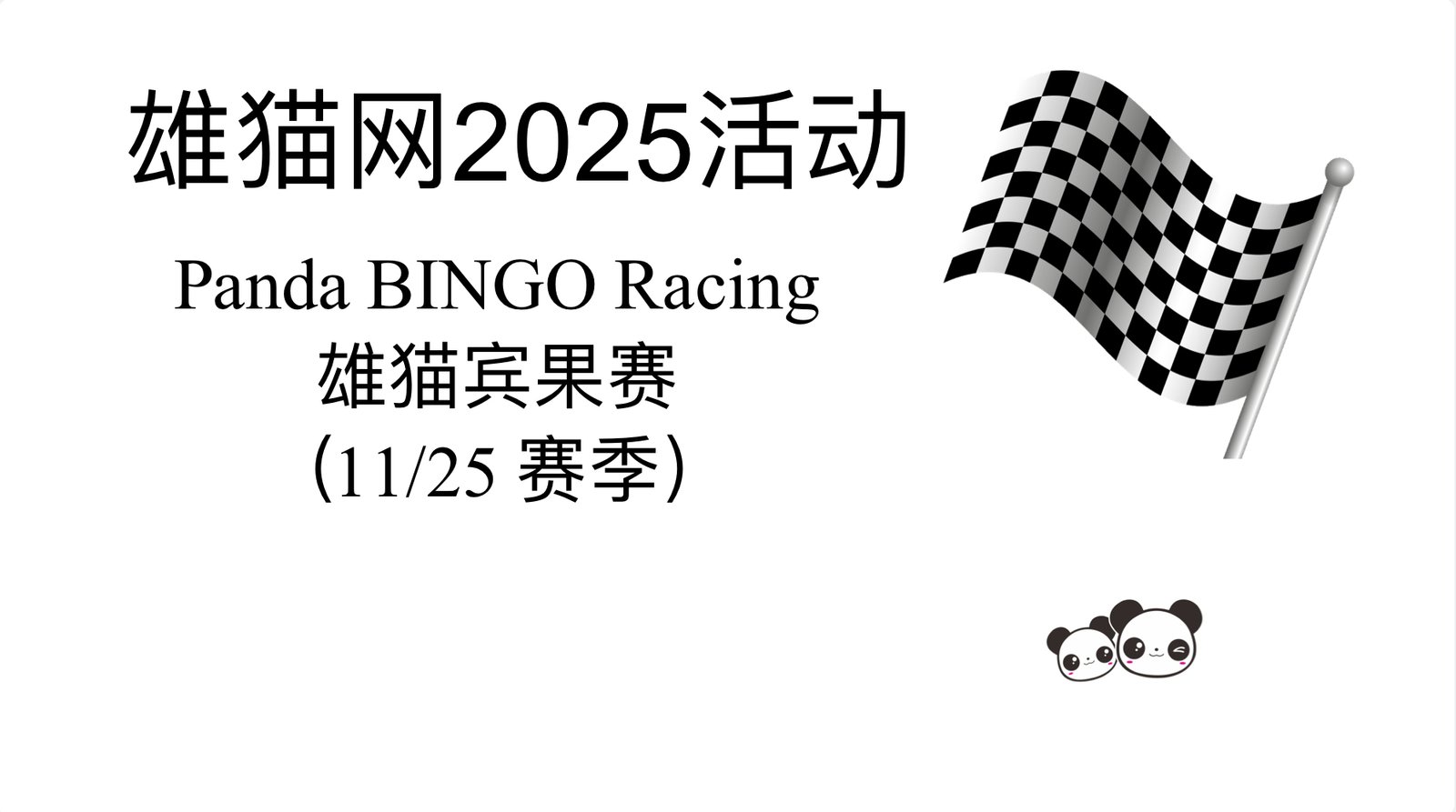 大家好!在11月份将会继续举办雄猫网活动- Panda BINGO Racing 雄猫宾果赛。