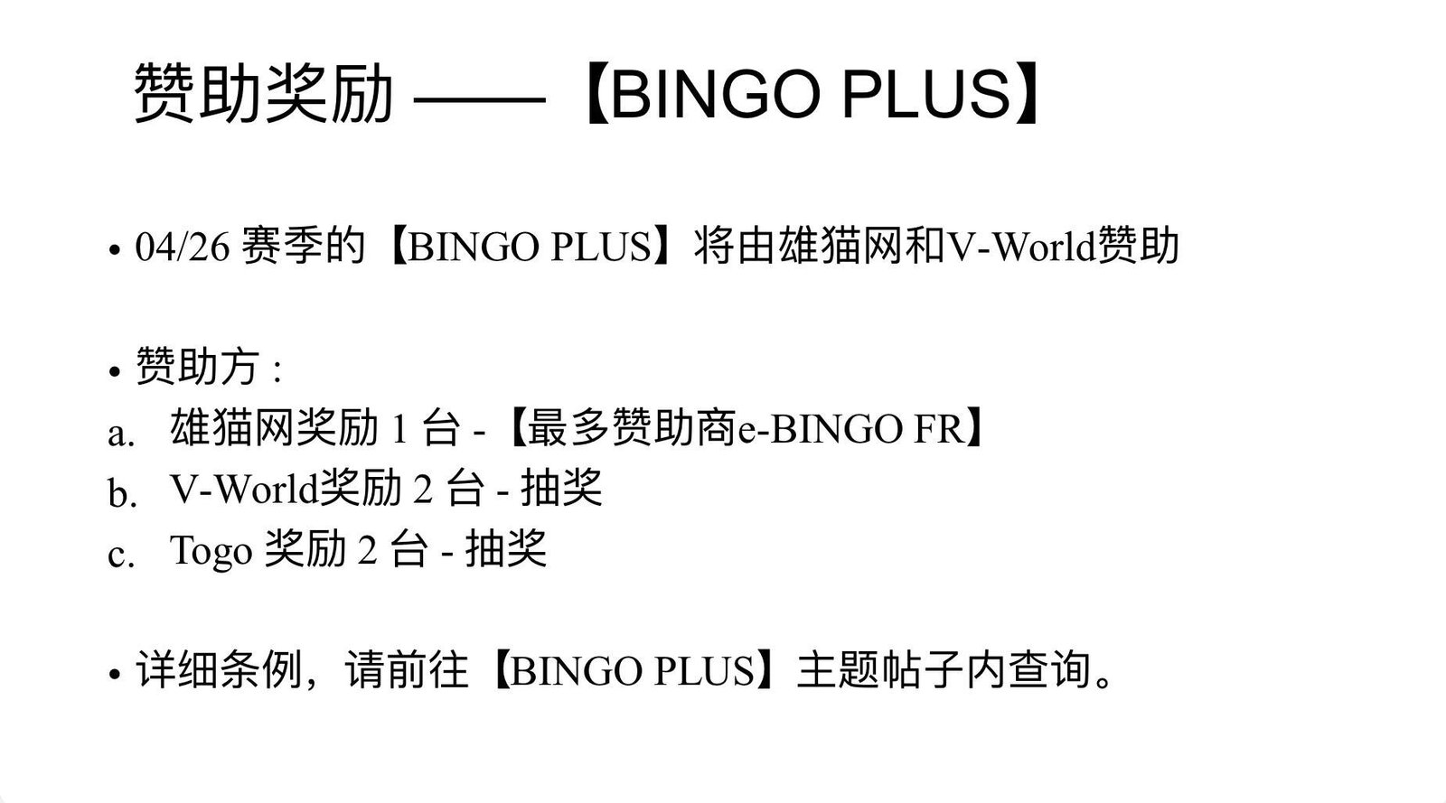 04/26 赛季将由以下公司赞助【BINGO PLUS】。