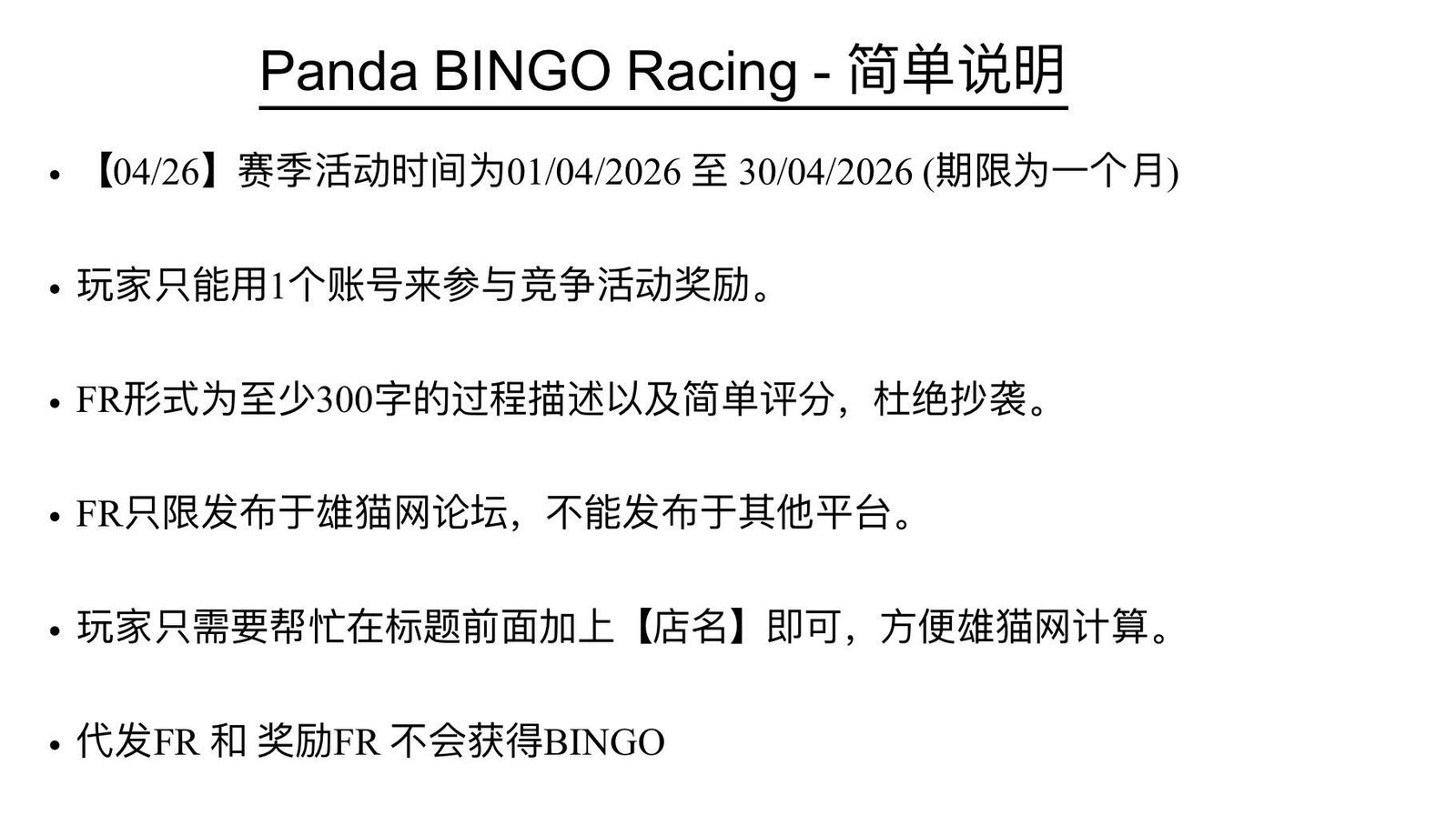 大家好!在2026年4月份将会继续举办雄猫网活动- Panda BINGO Racing 雄猫宾果赛。
